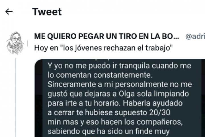 "Hoy en 'los jóvenes rechazan el trabajo", ha escrito la empleada junto a la captura de la conversación, en la que se ve cómo la empresaria anuncia: "Te voy a dar de baja. Aquí no ha sentado demasiado bien tu obsesión por cumplir y no hacer más horas de las que pone en el contrato".