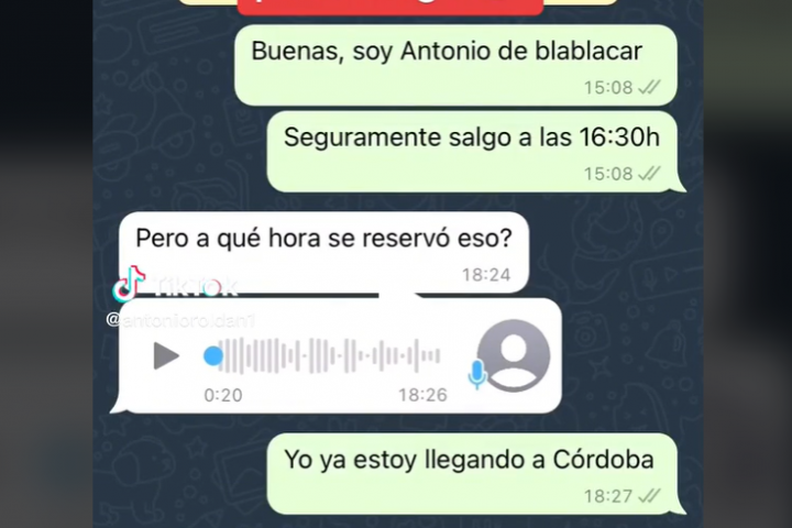 El usuario de TikTok @antonioroldan1 ha publicado un vídeo de la conversación de WhatsApp que ha tenido con una mujer con la que iba a compartir un viaje de Málaga a Córdoba, y lo que termina ocurriendo ha suscitado las risas en la plataforma.