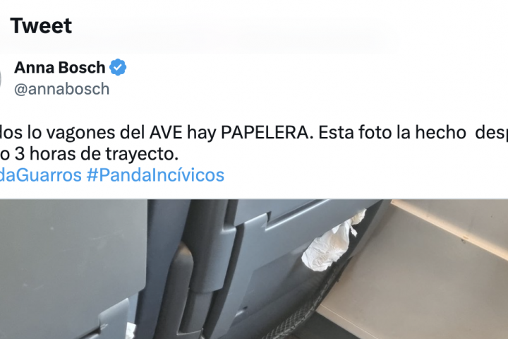 "En todos lo vagones del AVE hay PAPELERA. Esta foto la hecho después de sólo 3 horas de trayecto", ha escrito la periodista en Twitter. Junto a este comentario hay dos etiquetas "panda guarros" y "panda incívicos".