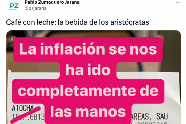 "Café con leche: la bebida de los aristócratas", ha escrito junto a la cuenta, en la que se ve que que tuvo que pagar 2,45 euros por la bebida. "La inflación se nos ha ido completamente de las manos", ha señalado en la imagen.