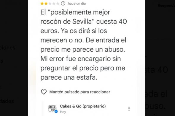 "El 'posiblemente mejor roscón de Sevilla' cuesta 40 euros. Ya os diré si los merecen o no. De entrada el precio me parece un abuso. Mi error fue encargarlo sin preguntar el precio, pero me parece una estafa", afirmó esa persona en una plataforma de valoración.