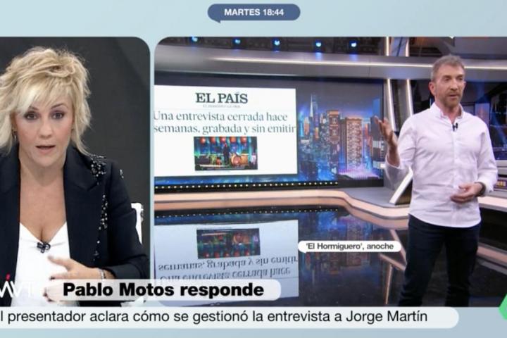 Cristina Pardo, colaboradora de El Hormiguero, ha sido una de las últimas en hablar de la respuesta que Pablo Motos le ha dado a David Broncano y a La Revuelta después de que éstos se quejasen el pasado jueves de que habían presionado al piloto Jorge Martín para que no fuese entrevistado en TVE antes que en Antena 3.