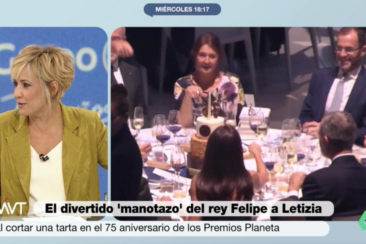 "Hay muchos medios que han definido el manotazo, incluido nosotros, como divertido pero no sé", ha empezado diciendo la presentadora. "A ver si quería apuñalar a alguien", ha dicho en tono de humor Iñaki López cuando en la mesa han dicho que no sabían lo que quería hacer Letizia con la tarta.