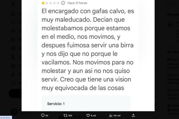 "El encargado de gafas calvo es muy maleducado. Decían que molestábamos porque estábamos en el medio, nos movimos y después fuimos a servir una birra y nos dijo que no porque le vacilamos. Nos movimos para no molestar y aún así no nos quiso servir. Creo que tienen una visión muy equivocada de las cosas", es la crítica del comensal, que ha dado al local la puntuación mínima en la plataforma de valoración.