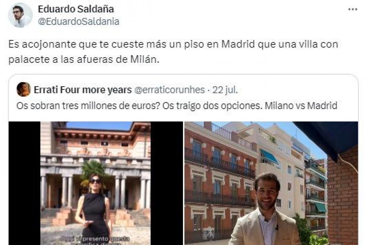 El tuitero Eduardo Saldaña (@EduardoSaldania) ha subido una publicación a la red social X, anteriormente conocida como Twitter, en la que ha citado en tono crítico un tuit donde se ven dos vídeos de propiedades inmobiliarias a la venta en Madrid y en Milán.