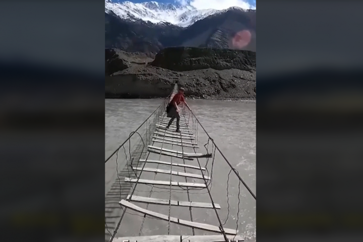 El usuario de TikTok @ramilladeaventura ha subido un vídeo en el que aparece cruzando el que denomina "el puente colgante más peligroso del mundo", que está en la región de Hunza, norte de Pakistán.