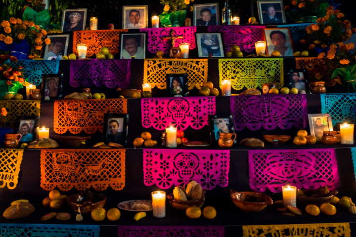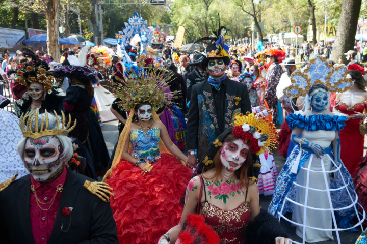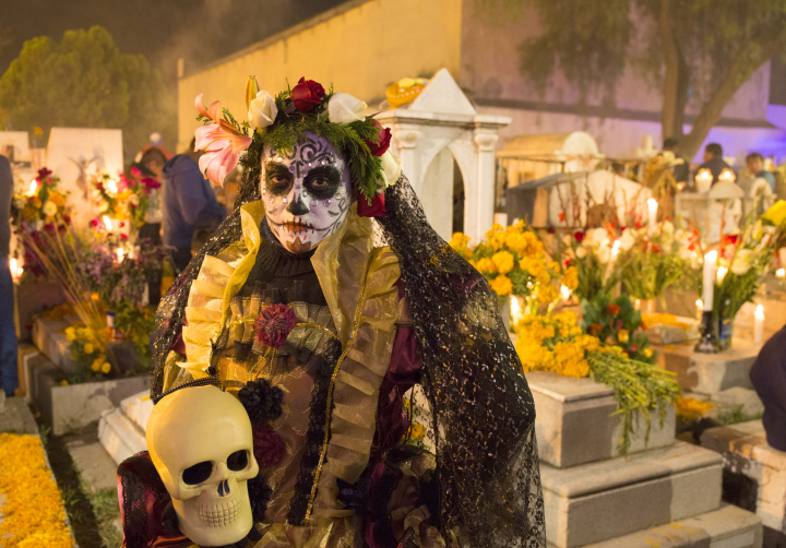 Esta popular festividad mexicana, que tiene lugar el 1 y 2 de noviembre, consiste en hacer fiestas en los cementerios, ofrecer comida y bebida a sus difuntos y organizar pasacalles colosales celebrando la muerte.