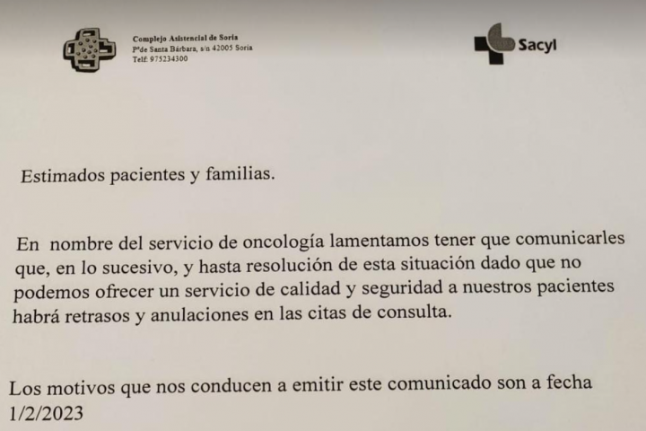 La salud en Castilla y León vuelve a estar en el punto de mira. El servicio de oncología del Hospital Santa Bárbara (Soria) colgó hace unos días un cartel advirtiendo de que, debido a la falta de personal, "habrá retrasos y anulaciones en las citas de consulta" a partir del 1 de febrero de 2023.