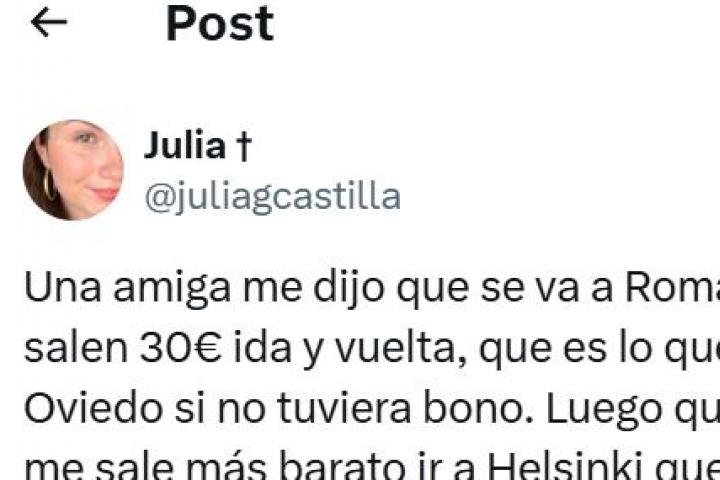 "Una amiga me dijo que se va a Roma y vuelve en 24h porque los vuelos le salen 30€ ida y vuelta, que es lo que me costaría a mí el bus Santander-Oviedo si no tuviera bono", ha comenzado diciendo la tuitera.