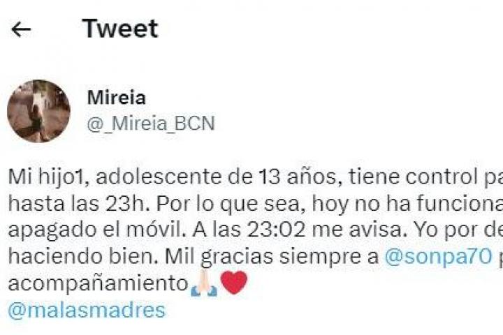 "Por lo que sea, el control parental no ha funcionado y no se le ha apagado el móvil. A las 23:02 me avisa. Yo por dentro pienso, algo estaré haciendo bien", ha escrito orgullosa la progenitora.