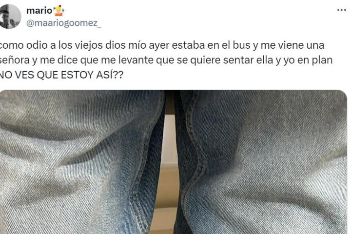 "Cómo odio a los viejos, ayer estaba en el bus y me viene una señora y me dice que me levante que se quiere sentar ella y yo en plan NO VES QUE ESTOY ASÍ??", ha escrito en la red social de Elon Musk. Además, ha publicado una imagen en la que se ve las piernas del tuitero estando vendadas a la altura de las rodillas.