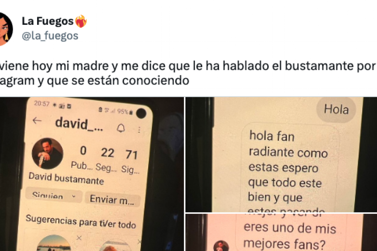 "Me viene hoy mi madre y me dice que le ha hablado el Bustamante por Instagram y que se están conociendo", así ha acompañado la usuaria de Twitter La Fuegos (@la_fuegos) los pantallazos de la conversación que había mantenido su madre con una cuenta falsa de alguien que se hacía pasar por el artista cántabro.