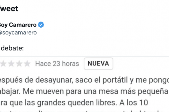 Encendido debate el que se ha abierto en Twitter esta semana a raíz de una publicación de Soy Camarero, cuenta especializada en compartir contenido relacionado con la hostelería. Todo a cuenta de un usuario que ha puesto una mala reseña a un local porque ha sacado el portátil para trabajar y lo han echado.