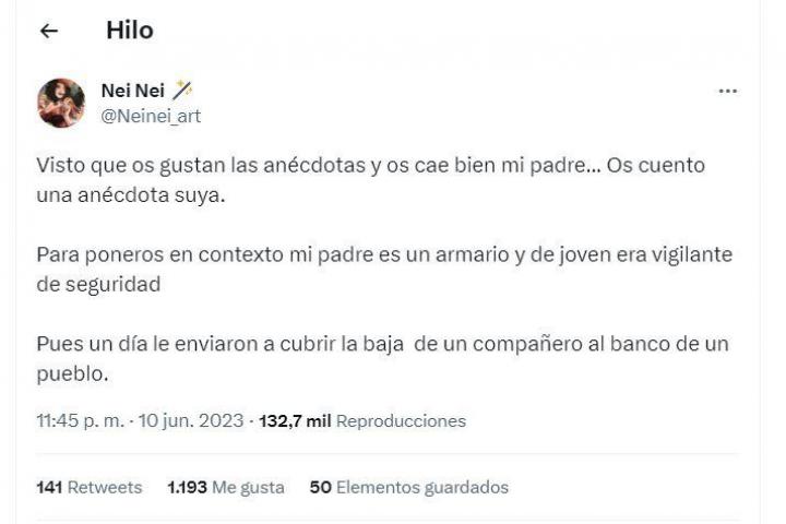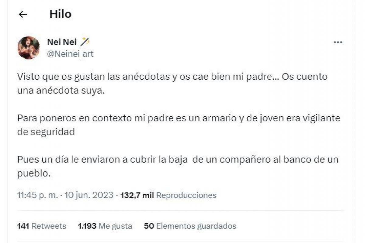 La usuaria de Twitter @Neinei_art ha relatado una anecdótica historia de lo que le ocurrió a su padre trabajando por primera vez como vigilante de seguridad en el banco de un pueblo.