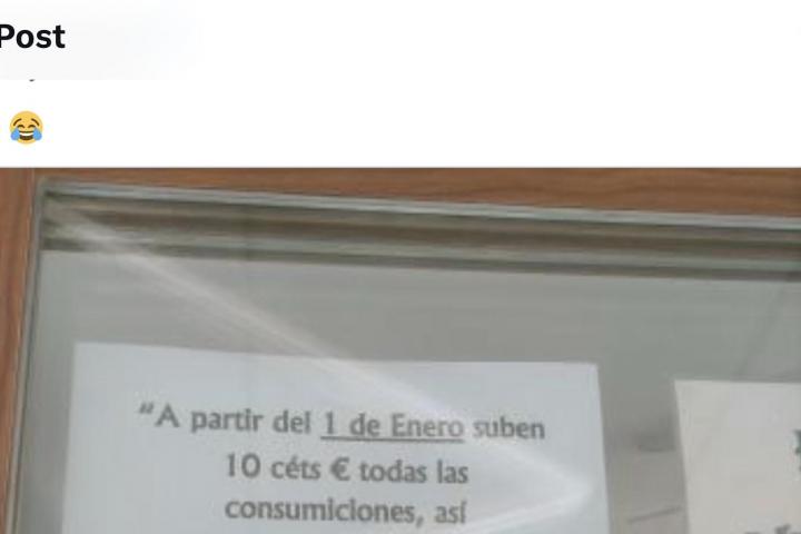 "A partir del 1 de enero suben 10 céntimos todas las consumiciones así que luego no empecéis a darme el coñazo", reza el cartel colocado en la puerta del bar escrito a ordenador.