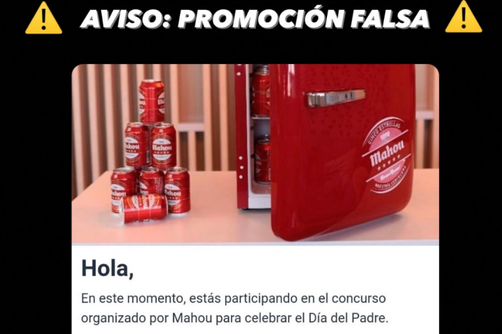 La marca de cerveza Mahou ha alertado de la estafa que se está difundiendo rápidamente aprovechando el Día del Padre. "Cuidado", ha advertido, y ha añadido que han detectado "esta promoción y se trata de un fake".