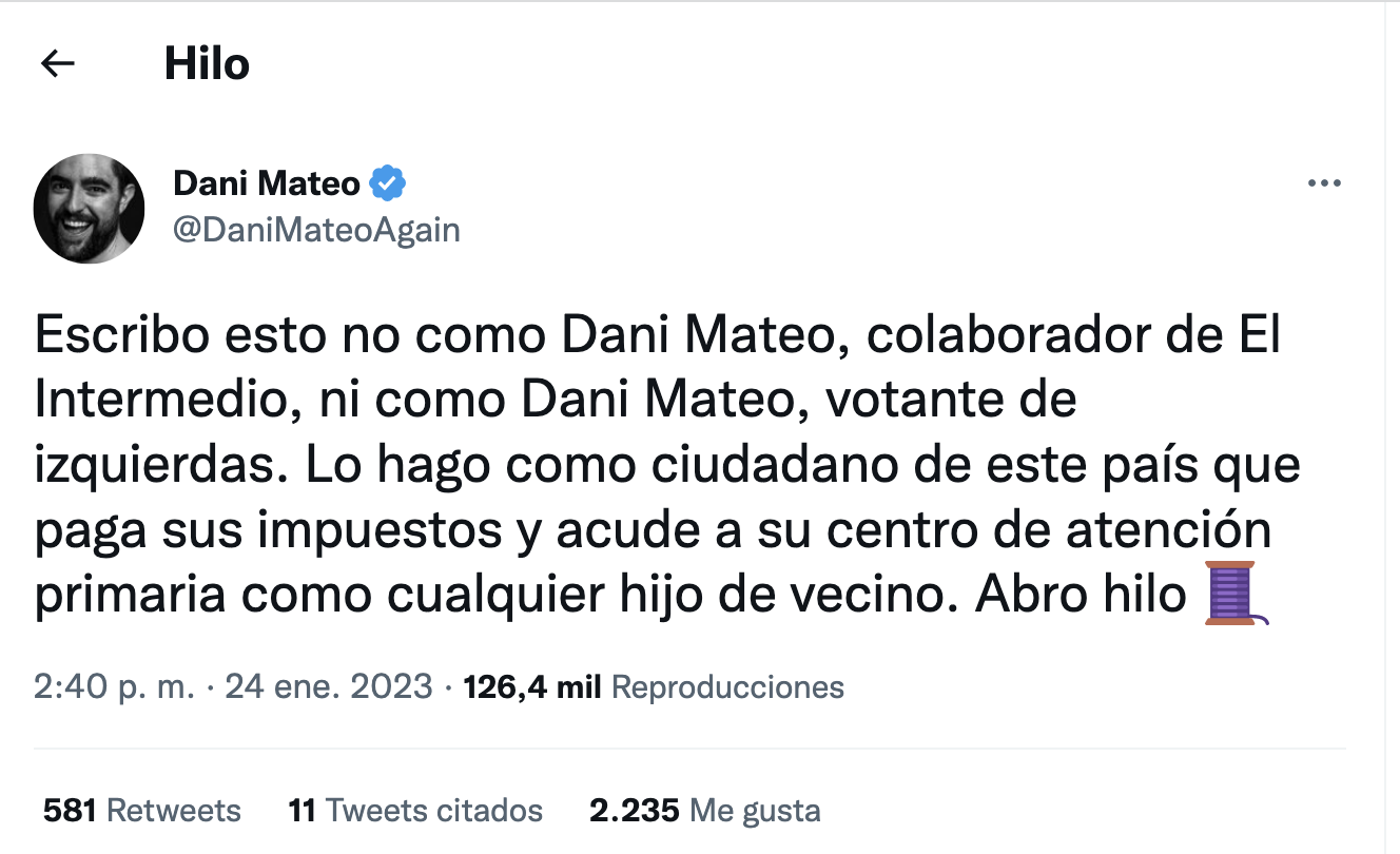 El cómico Dani Mateo ha publicado en Twitter un hilo con su experiencia al acudir a un centro de atención primaria en Madrid. Ha empezado diciendo que ha escrito los tuits "como ciudadano de este país que paga sus impuestos y acude a su centro de atención primaria como cualquier hijo de vecino" y no como "Dani Mateo, colaborador de El Intermedio, ni como Dani Mateo, votante de izquierdas".