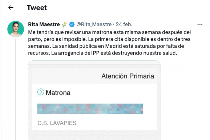 Maestre, que ha sido madre recientemente, publicó un tuit con un pantallazo en el que se veía que la primera fecha disponible para que le viera una matrona era el día 17 de marzo.