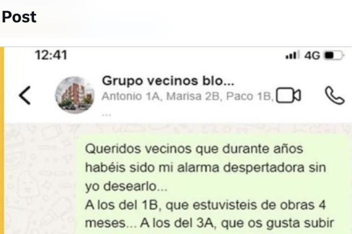 Ahora ha dado que hablar el mensaje que una persona ha dejado en un grupo de whatsapp del vecindario y donde con mucho sentido del humor retrata a los vecinos de al lado.