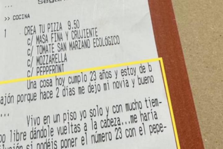 Y vaya que si se puede. Los de la pizzería le pusieron el 23 con pepperoni y además le dejaron una nota de lo más emotiva: "Si tienes un piso para ti solo y mucho tiempo libre adopta un perrito, verás como de rápido te olvidas de tu chica. Felicidades".