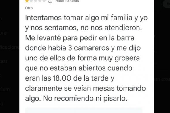 El cliente criticaba que fueron al local a intentar "tomar algo mi familia y yo", y al sentarse, no les atendieron. "Me levanté para pedir en la barra donde había 3 camareros y me dijo uno de ellos de forma muy grosera que no estaban abiertos, cuando eran las 18:00 de la tarde y claramente se veían mesas tomando algo. No recomiendo ni pisarlo", ha escrito, enfadadísimo, el cliente.