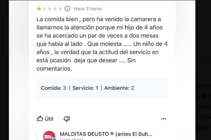 Ha tenido lugar después de que un cliente de ese restaurante se quejase del trato que los trabajadores dieron a su hijo pequeño. "La comida bien", empezaba admitiendo el comensal antes de criticar: "Pero ha venido la camarera a llamarnos la atención porque mi hijo de cuatro años se ha acercado un par de veces a dos mesas que había al lado".