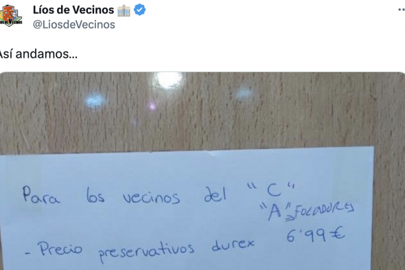 "Para los vecinos del C, A 'folladores'. Precio de los preservativos Durex 6,99. Precio de tirarlos por la basura y no por la ventana Gratis. Gracias", dice el cartel.