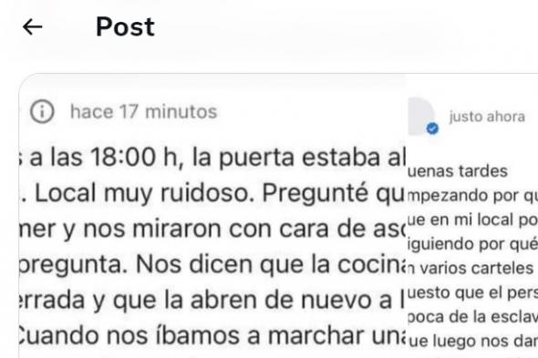 Pero el dueño del restaurante no dudó ni un segundo en defenderse de las acusaciones. "Buenas tardes. Empezando porque la barrera estaba cerrada puesto que en mi local pongo a mi conveniencia los horarios. Siguiendo porque tenemos horario de cocina indicado en varios carteles", justificó el dueño.
