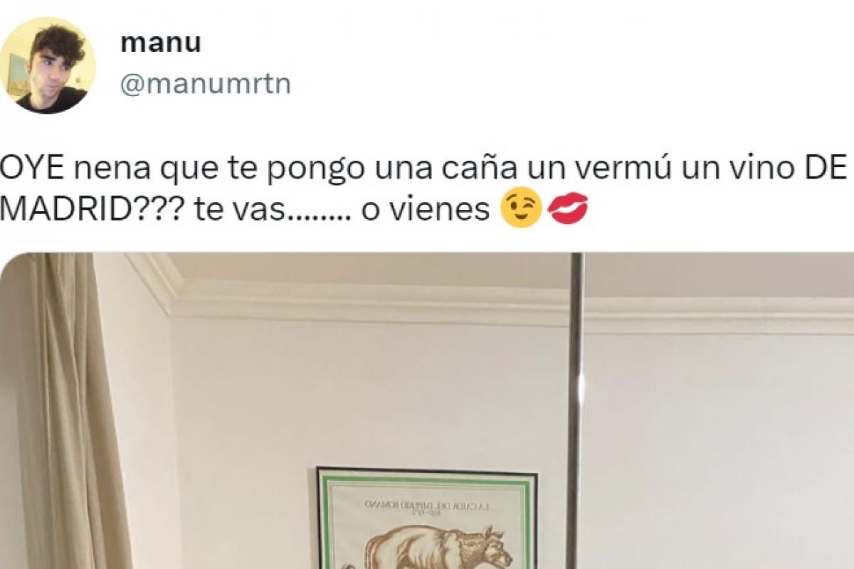 "OYE nena que te pongo una caña un vermú un vino DE MADRID??? te vas........ o vienes 😉💋", ha asegurado, en clara referencia a una de las frases del artista Mario Vaquerizo en la campaña de Turismo de la Comunidad de Madrid.