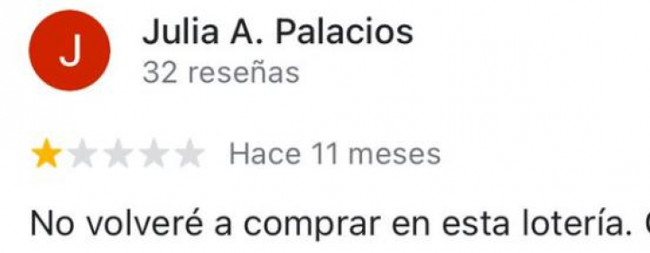 "No volveré a comprar en esta lotería. Creo que no ha tocado nada en más de 10 años. Tampoco tienen comprobador automático. Añejos y con mal carácter", escribió Julia hace 11 meses en las reseñas de la administración. Y la mala suerte llegó porque esa misma administración acaba de vender el Gordo de Navidad... ¡De forma íntegra!