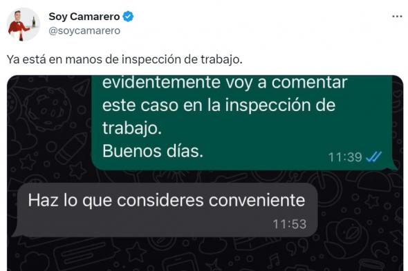 "Le comenté que iba a ir a la inspección de trabajo, me dijo que hiciera lo que creyera conveniente. Entonces se lo mandé a SoyCamarero y salieron a comentar con varias versiones sobre por qué me echaron, la última fue llamarme racista", ha explicado.