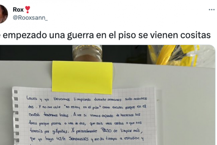 La joven añadió que pasa de limpiar más porque hace 42 horas semanales y aun así le da tiempo a estudiar y limpiar. "A buenas por WhatsApp no funciona, a ver si así lo veis todos los días hasta que limpiéis, que estoy harta de recoger tazas, cenizas, platos, zapatillas, etc que no son mías", afirmó.