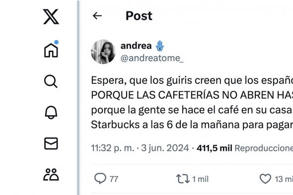 "Espera, que los guiris creen que los españoles se levantan tarde PORQUE LAS CAFETERÍAS NO ABREN HASTA LAS 8", ha empezado diciendo, llegando incluso a usar mayúsculas.