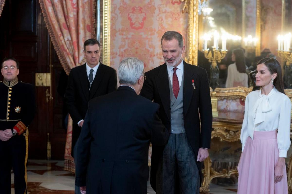 Una imagen de la recepción al cuerpo diplomático acreditado en España en el Palacio Real de Madrid ha provocado sorpresa y multitud de comentarios e incluso mofas por la indumentaria que lucía en el acto el ministro de Exteriores, José Manuel Albares.