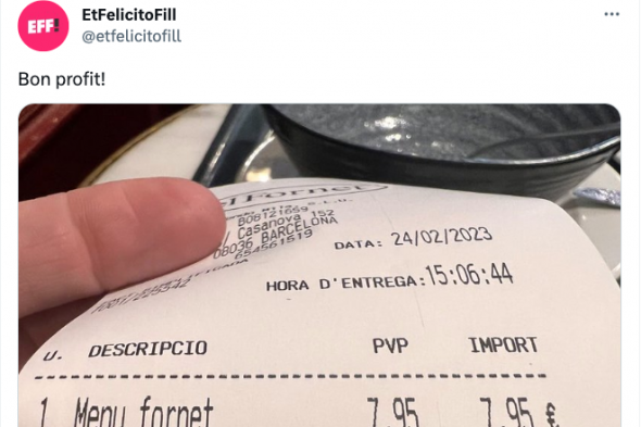 En el caso que ha subido a Instagram y a Twitter @etfelicitofill hay algo de eso, aunque no buscado por los hosteleros. En la foto se ve la cuenta de un restaurante en el que, en catalán, se ve que se cobra el llamado "menú fornet".