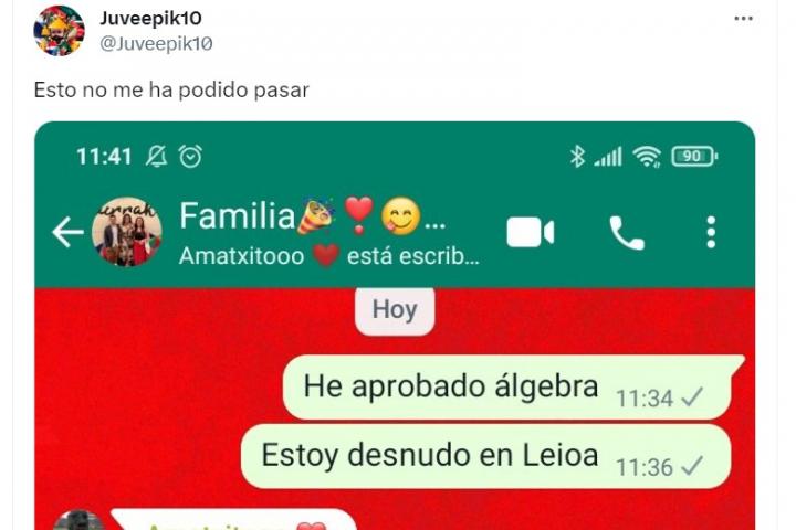"He aprobado álgebra. Estoy desnudo en Leioa", dice el usuario. Su madre responde a los dos minutos con el corazón en un puño: "¿Cómo? ¿Desnudo? Estoy preocupada".