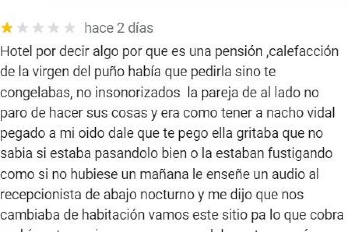 En su reseña, encabezada por solo una estrella de cinco, la huésped lamenta que "la pareja de al lado no paró de hacer sus cosas y era como tener a Nacho Vidal pegado" a su oído.