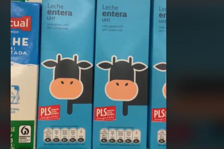 Sin embargo, esto no ha podido evitar grabarlo. Mientras estaba en un supermercado, se dio cuenta de lo que pasaba con unos bricks de leche en una de las estanterías. Los envases están 'conectados'. La imagen principal de la leche entera de la marca 'El Corte Inglés' es el cuerpo de una vaca, que se divide en dos caras del brick.