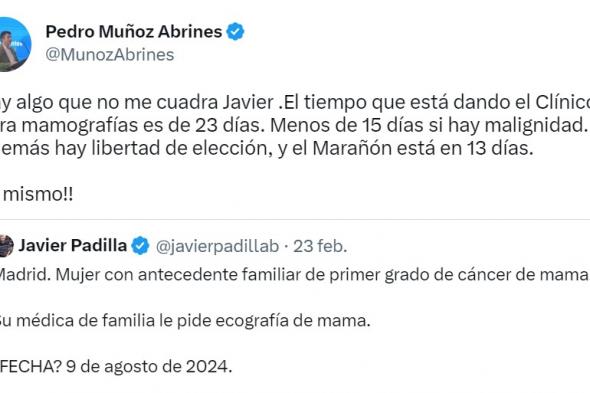 A este tuit le ha respondido el diputado del PP en la Asamblea de Madrid Pedro Muñoz, que ha desconfiado de la información aportada por Padilla: "Hay algo que no me cuadra Javier. El tiempo que está dando el Clínico para mamografías es de 23 días. Menos de 15 días si hay malignidad. Además hay libertad de elección, y el Marañón está en 13 días".