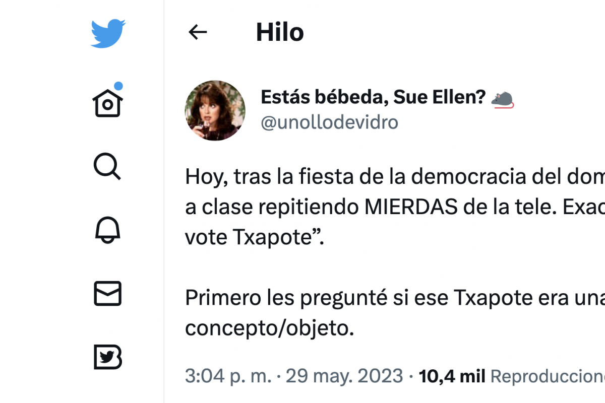 Ahora, una docente ha explicado que este lunes en clase algunos niños han gritado "que te vote Txapote". "Hoy, tras la fiesta de la democracia del domingo, algunos niños vinieron a clase repitiendo MIERDAS de la tele. Exacto, una de ellas era 'que te vote Txapote'. Primero les pregunté si ese Txapote era una persona o un concepto/objeto", ha empezado diciendo.