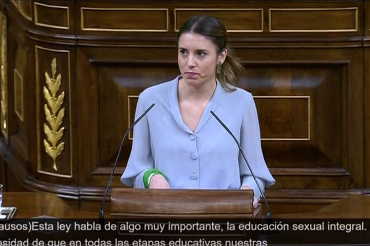 "La necesidad de que en todas las etapas educativas, de forma obligatoria, nuestros hijos, hijas e hijes tengan derecho...", dijo la dirigente de Podemos antes de tener que callarse ante el revuelo provocado en la Cámara.