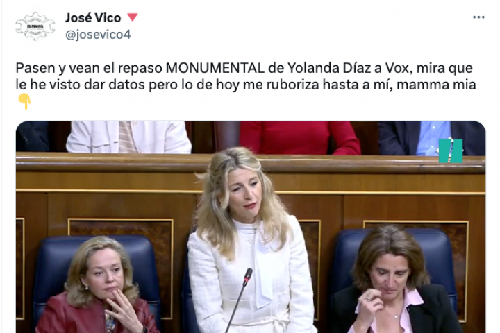 La respuesta de poco más de dos minutos que ha dado Yolanda Díaz, vicepresidenta segunda del Gobierno y ministra de Trabajo, a la diputada de Vox Inés María Cañizares está teniendo una gran repercusión en Twitter, donde supera en apenas unas horas más de 110.000 reproducciones.