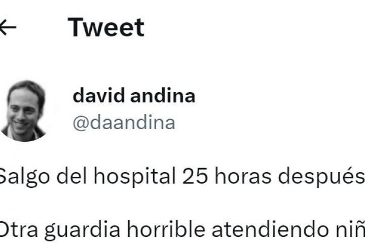 El pediatra de Urgencias del hospital Niño Jesús de Madrid David Andina ha compartido un duro alegato sobre lo que ha tenido que pasar durante las "25 horas" que ha estado trabajando en el centro hospitalario.