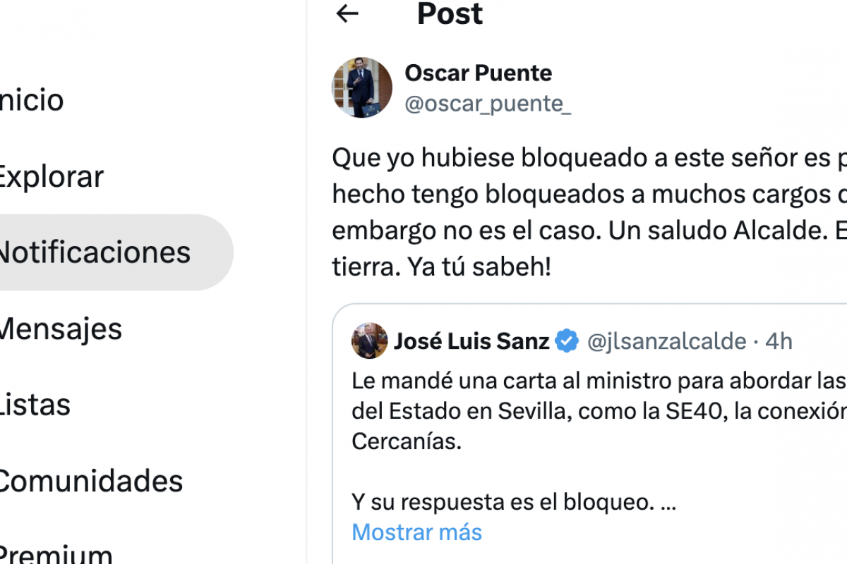 El alcalde de Sevilla, José Luis Sanz, se ha quejado en X, anteriormente Twitter, de que el ministro de Transportes, Óscar Puente, lo tiene bloqueado. Algo que ha provocado alboroto en redes por varios motivos.