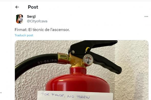 Como ejemplo, la imagen que ha subido a X, la red social antes conocida como Twitter, el usuario @Cityofcava. En ella se ve el cartel que el técnico del ascensor ha tenido que dejar a los vecinos colgando de un extintor del portal.