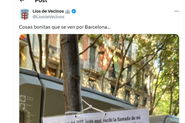 Un cartel que ha aparecido colgado de un árbol en una calle de Barcelona está provocando cientos de reacciones de admiración, hasta el punto de que se ha convertido en una verdadera lección de vida.