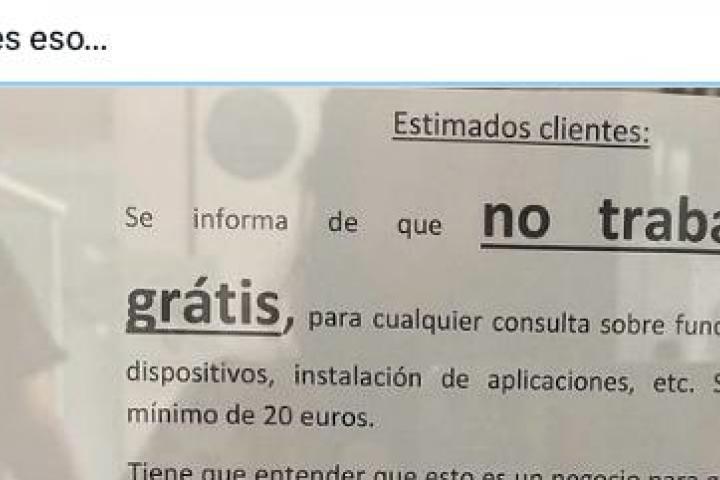 "Se informa de que no trabajamos gratis, para cualquier consulta sobre funcionamiento de dispositivos, instalación de aplicaciones, etc. Se cobrará un mínimo de 20 euros", empieza diciendo el cartel.