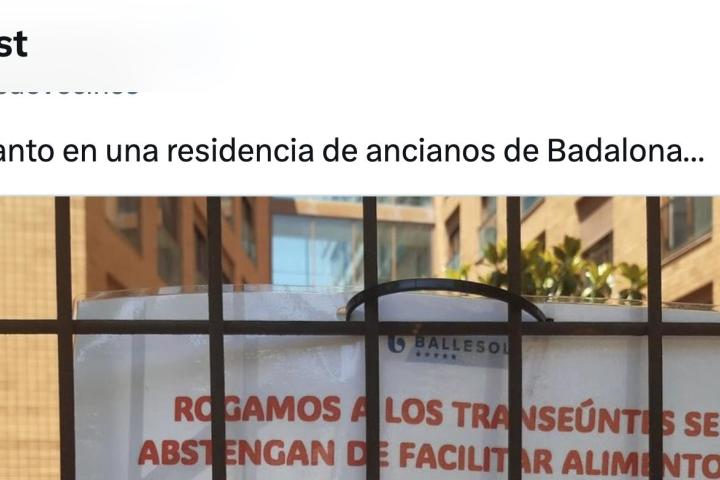 "Mientras tanto en una residencia de ancianos de Badalona…", se puede leer en la publicación junto a una foto de un cartel anclado a la valla de lo que parece un complejo en el que viven ancianos.