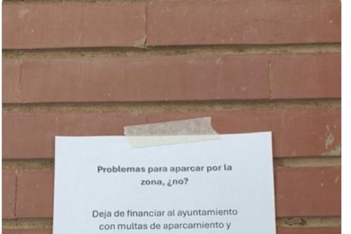"¿Problemas para aparcar por la zona, no? Deja de financiar al Ayuntamiento con multas de aparcamiento y cómprame la plaza de garaje que vendo en la Plaza Abril, anda, si es más por ti que por mí", empieza diciendo el cartel.