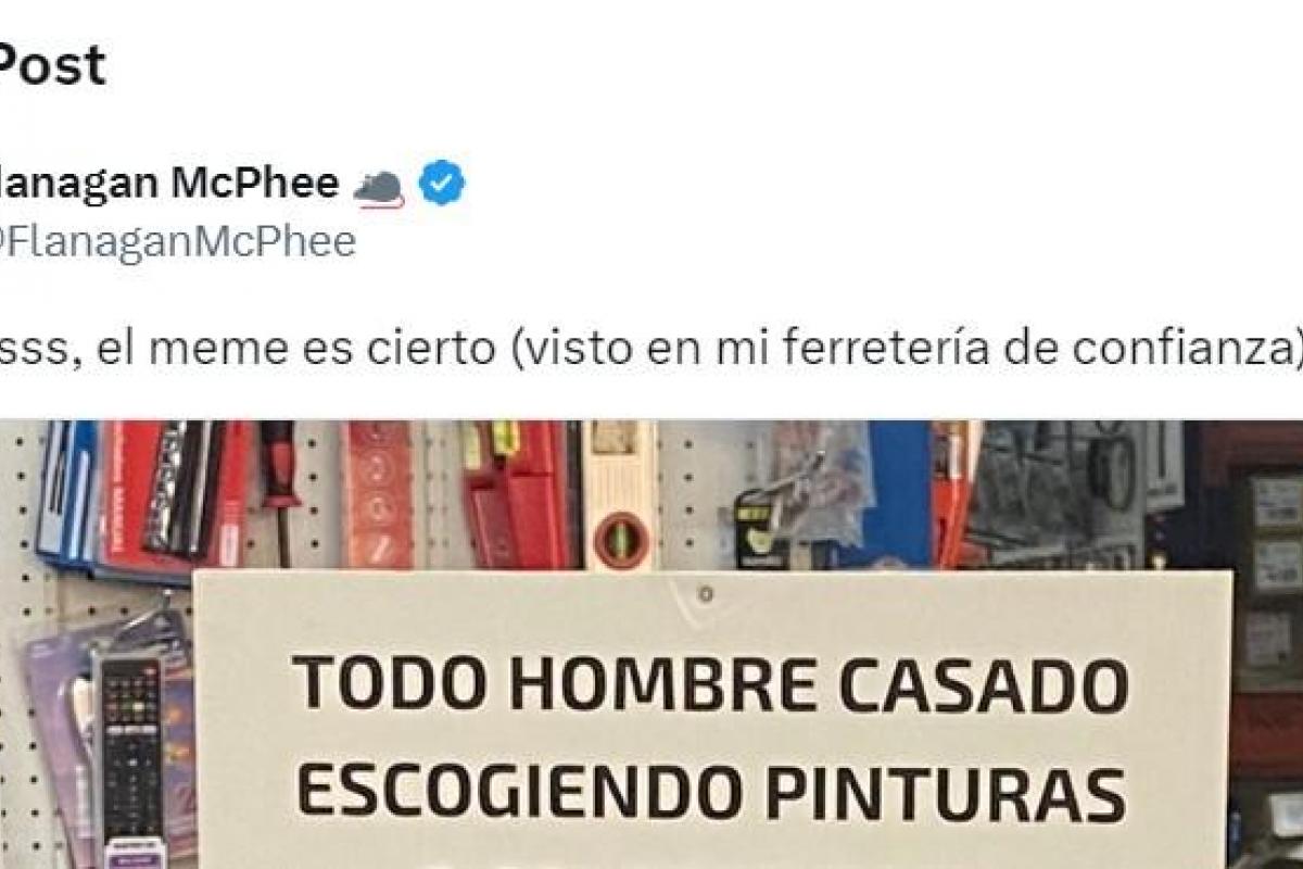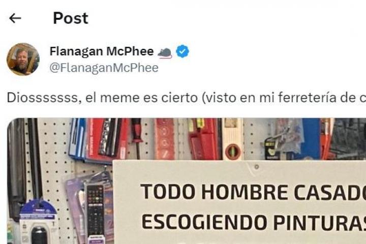 "Diosssssss, el meme es cierto (visto en mi ferretería de confianza)", ha escrito junto a la imagen del letrero, en el que se lee: "Todo hombre casado escogiendo pinturas o colores debe traer autorización de su esposa".